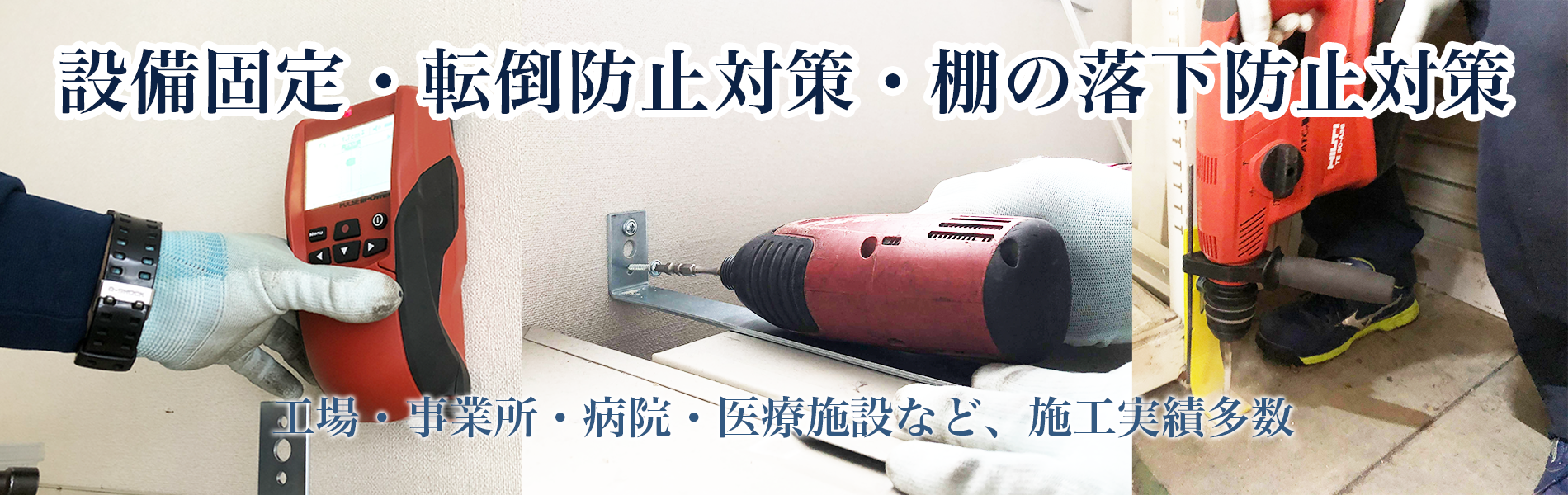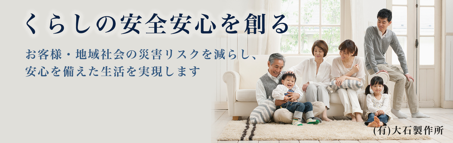 企画開発・検証 大石製作所では、様々な施工実績から、ノウハウを構築し、お客様のニーズにお応えする設備固定具と家具転倒防止器具の企画開発、実証実験を行っています。 金具・防災用品の製作販売 家庭用、オフィス事業所用、工場・倉庫等、設備固定、家具固定のための規格商品を製造販売しております。棚の落下防止対策、家具転倒防止対策はどなたでも簡単に行うことができる地震対策です。 地震対策の総合施工 創業より工場・物流倉庫・事業所の設備固定工事、病院・研究所等の家具及び設備固定の施工を行ってまいりました。施工実績に基づく確かな技術はノウハウとして、安心と信頼の製品開発へとつながっています。