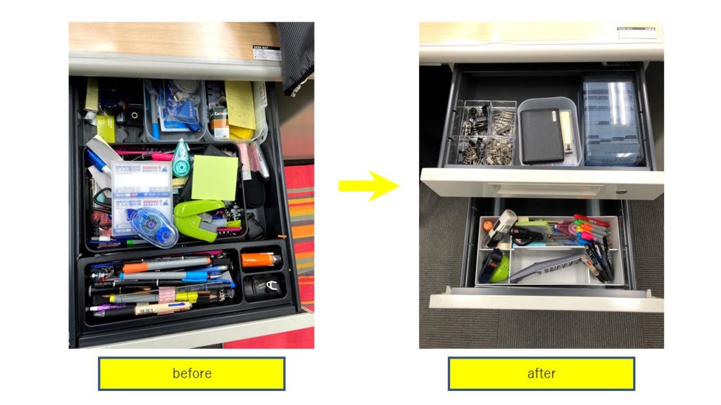 対象の書類棚や各自のデスクの中身を全て出し、分別後、業務に必要なものだけを戻していきます。