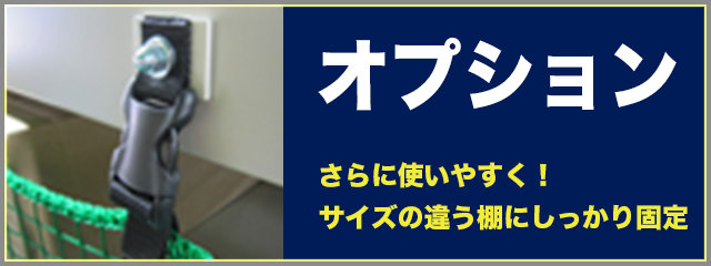 ハトメ付きネットを直接棚側にボルト固定し、収納物の落下を抑制します。