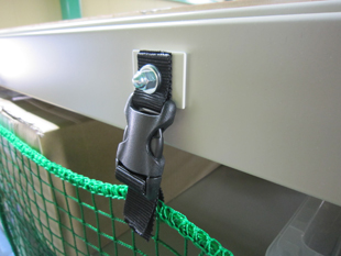 ハトメ付きネットを直接棚側にボルト固定し、収納物の落下を抑制します。