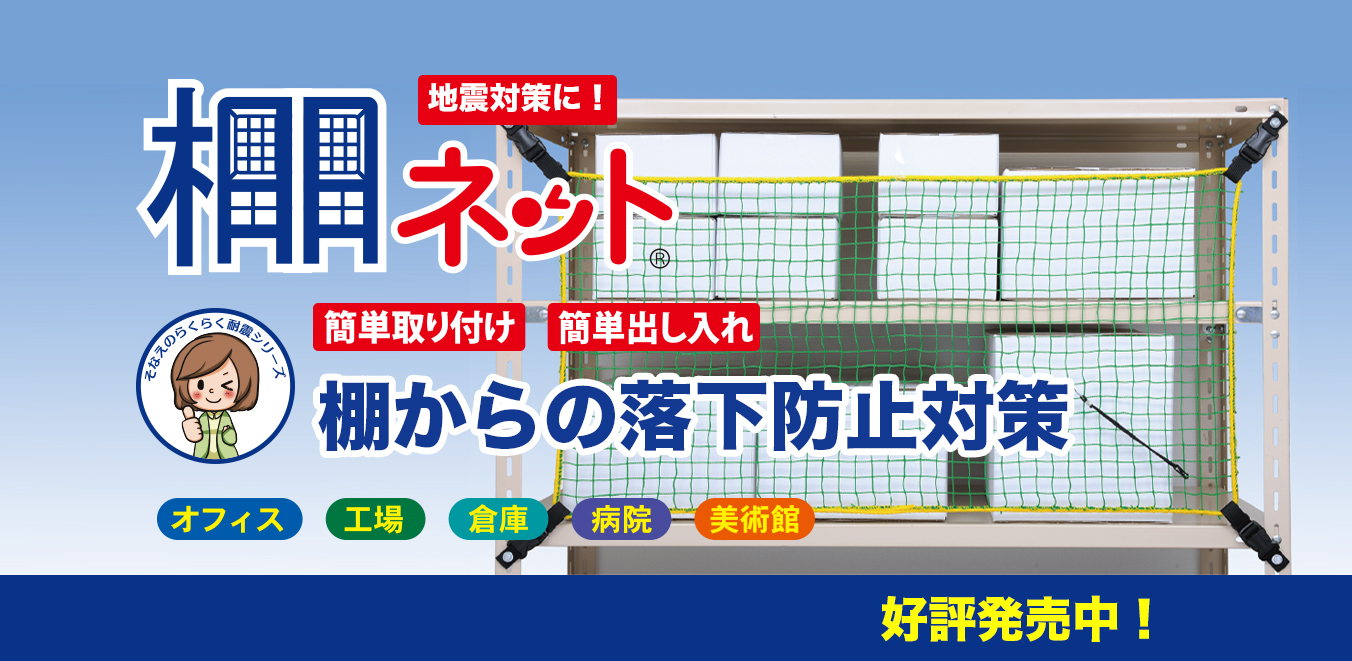 設備固定、棚ネット,棚からの落下防止対策、家具転倒防止の大石製作所